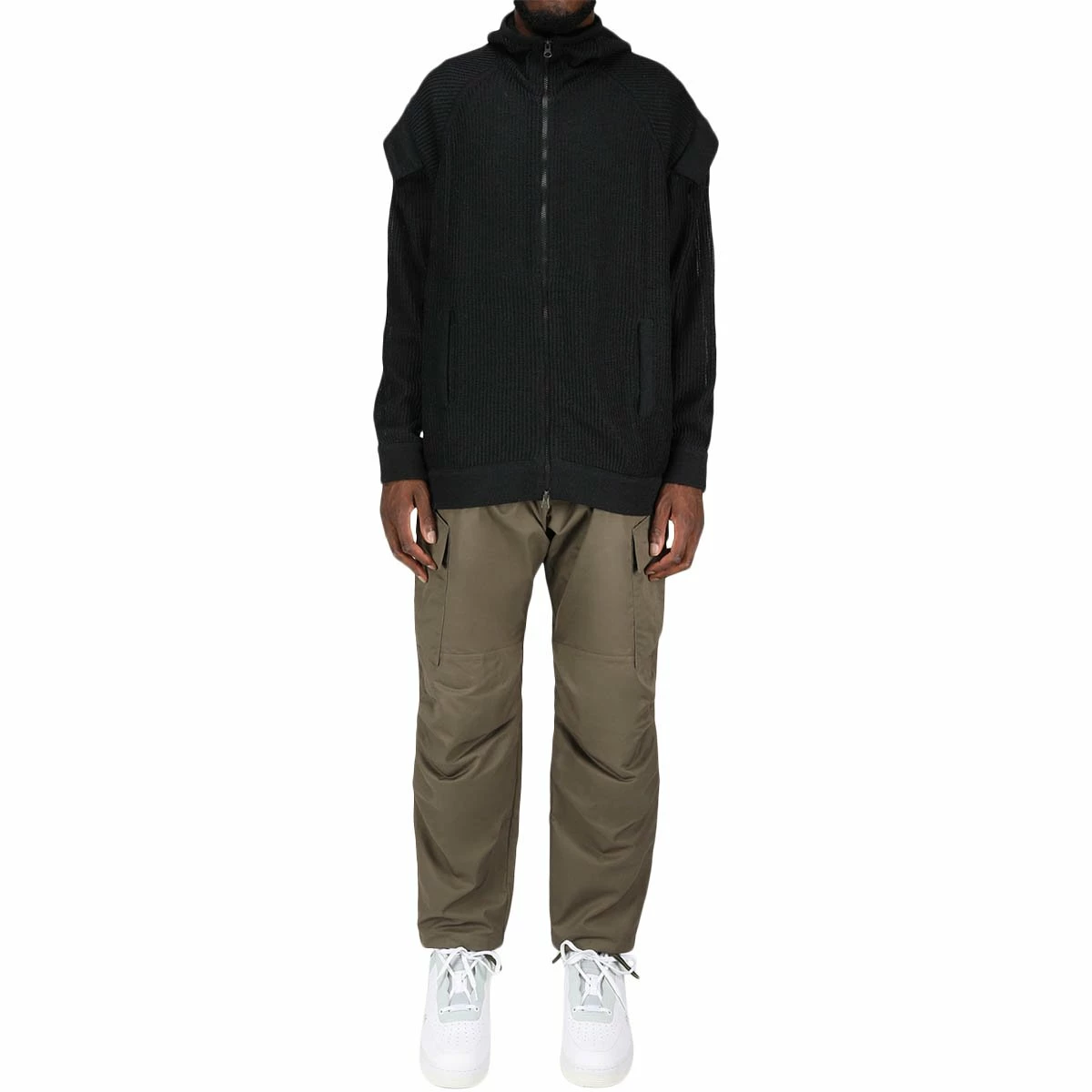 Hooded zip front jacket in grid mesh Cashllama wool and silk blend knit construction. Low profile ‘scuba’ hood ideal for layering.