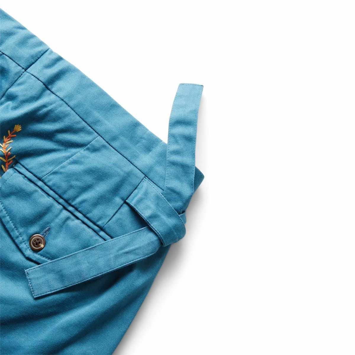 The Bell Flower Trouser is inspired by an early 20th-Century Embroidered blanket. It features labor-intensive chain stitch embroidery done by hand to create a gold and red-hued floral scene.Â