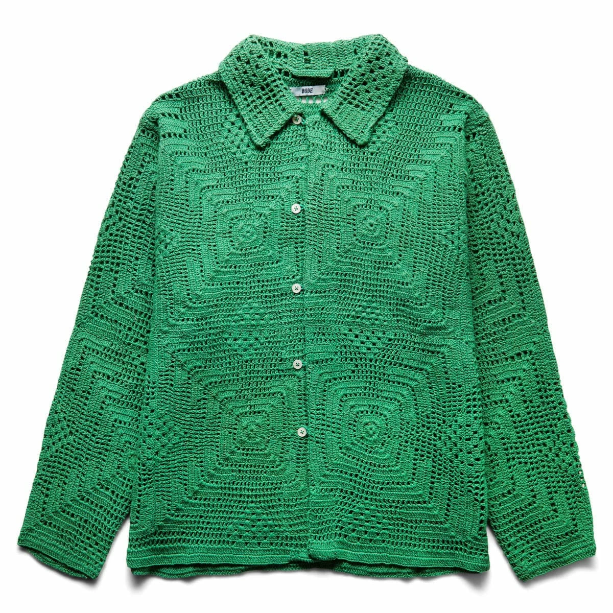 This crochet shirt is inspired by a crochet tablecloth, circa 1950s-1960s. After World War II, home crocheting saw a resurgence in popularity. Potholders and tablecloths were made from thick bright-colored yarns.