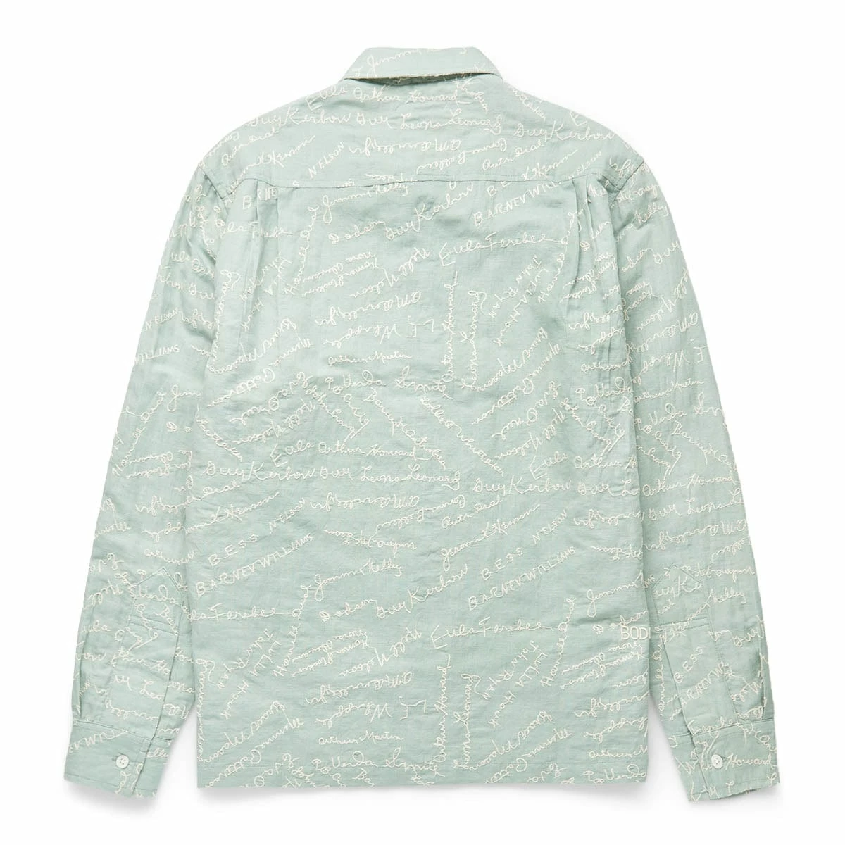 This long sleeve shirt is inspired by a 1950s embroidered panel. The shirt features a faithful reproduction of the all-over embroidery of various names. Groups of friends would often sign fabric which would then be embroidered and used for pillowcases or other mementos.Â