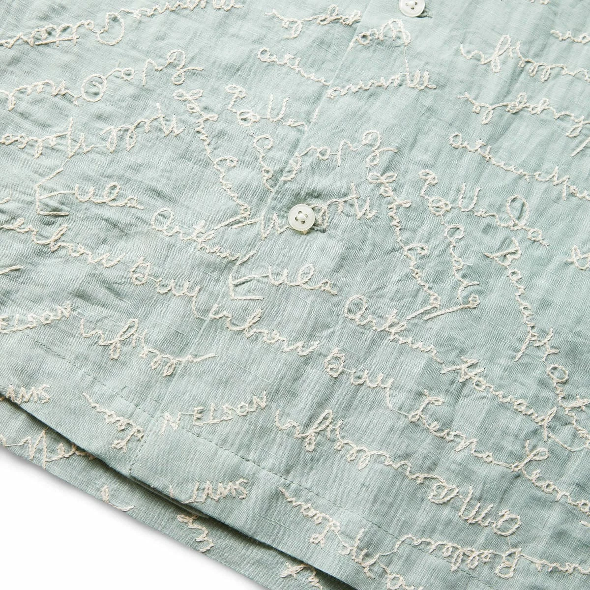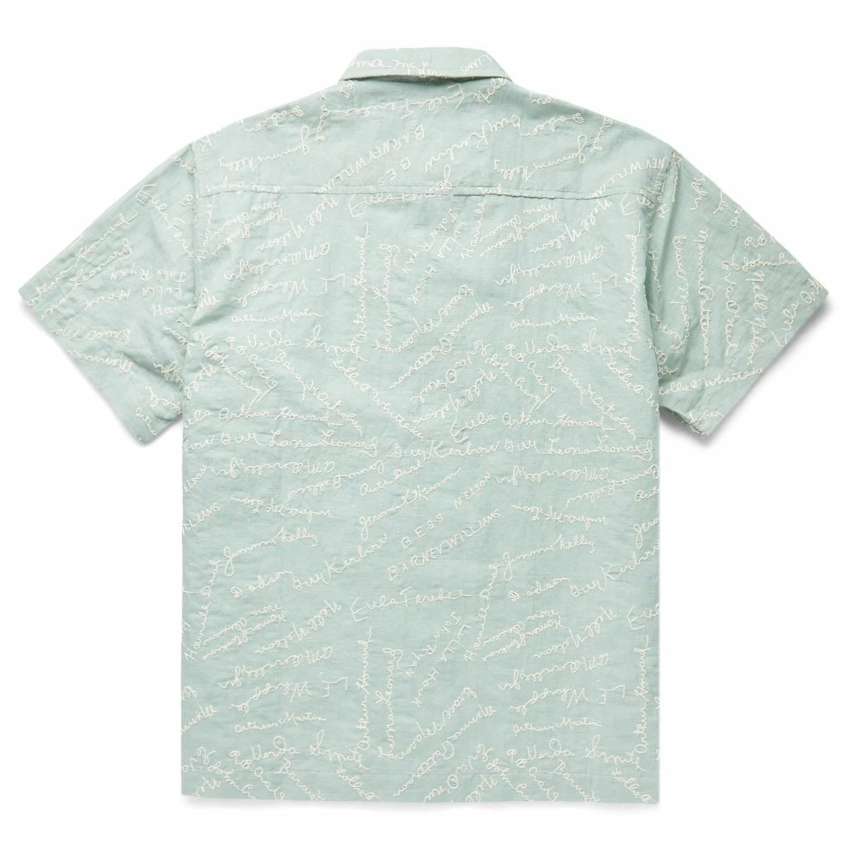 The Powder Signature Short Sleeve shirt is inspired by a 1950s embroidered panel. The shirt features a faithful reproduction of the all-over embroidery of various names. Groups of friends would often sign fabric which would then be embroidered and used for pillowcases or other mementos.Â