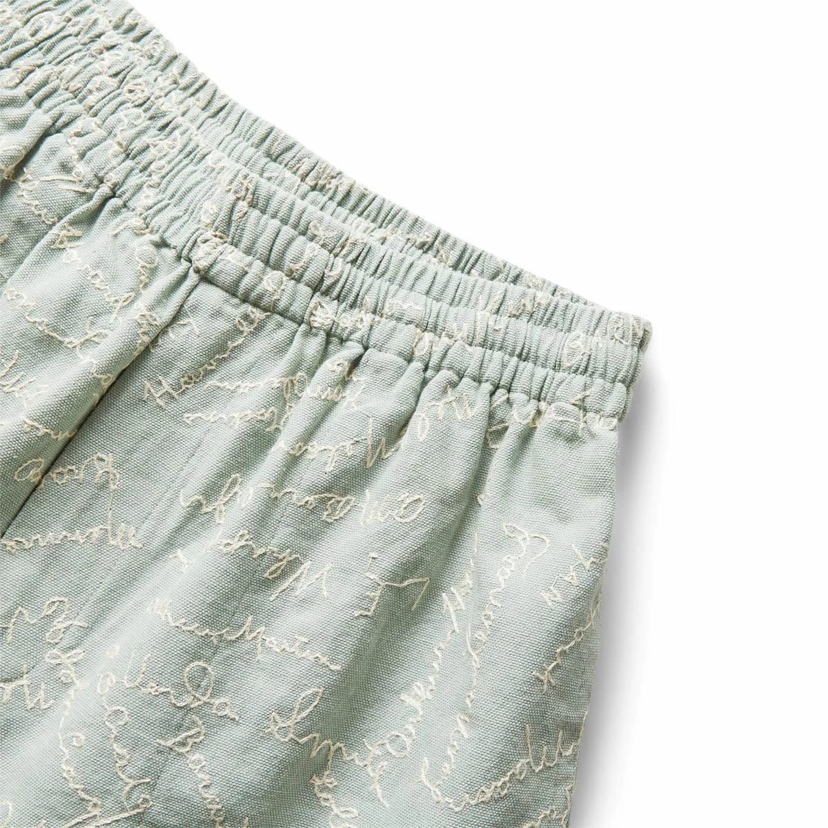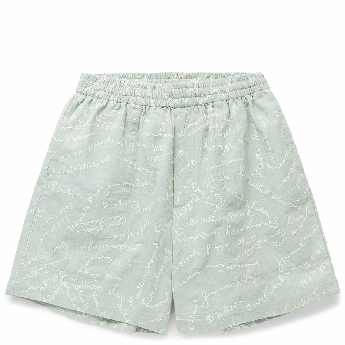 These shorts are inspired by a 1950s embroidered panel. The shorts feature a faithful reproduction of the all-over embroidery of various names. Groups of friends would often sign fabric which would then be embroidered and used for pillowcases or other mementos. The silhouette is that of a traditional trouser — high rise, straight leg. The shorts silhouette is reminiscent of traditional rugby shorts worn throughout Canada with a short inseam and wide leg opening.