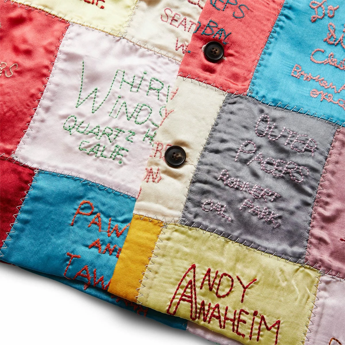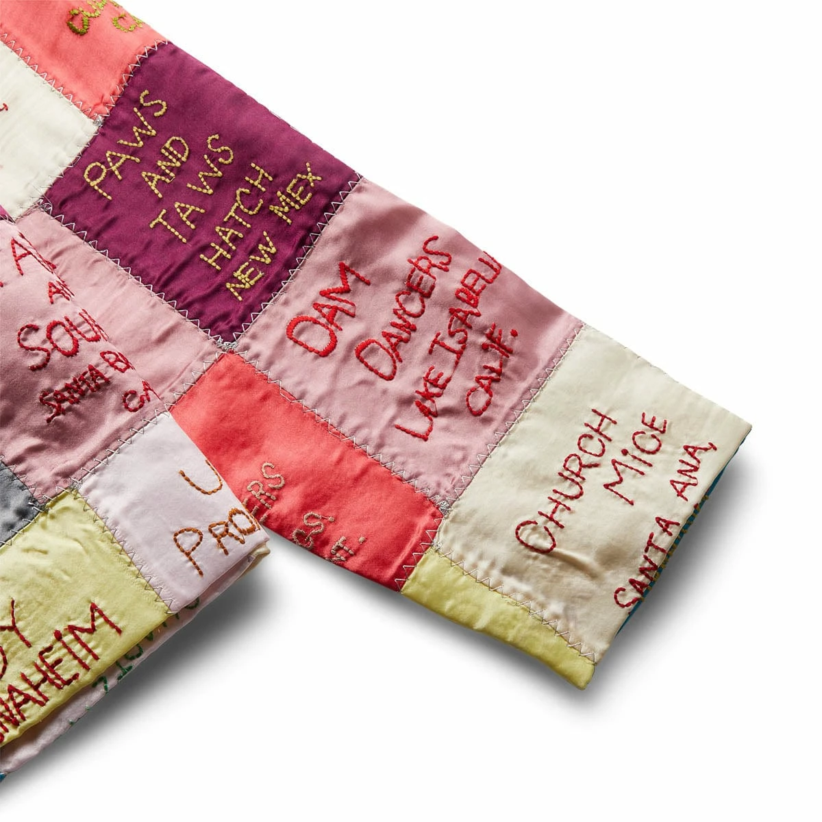 A colorful patchwork of satin squares hand-embroidered with dance-hall locations across the country bring a playful jive to this boxy jacket.