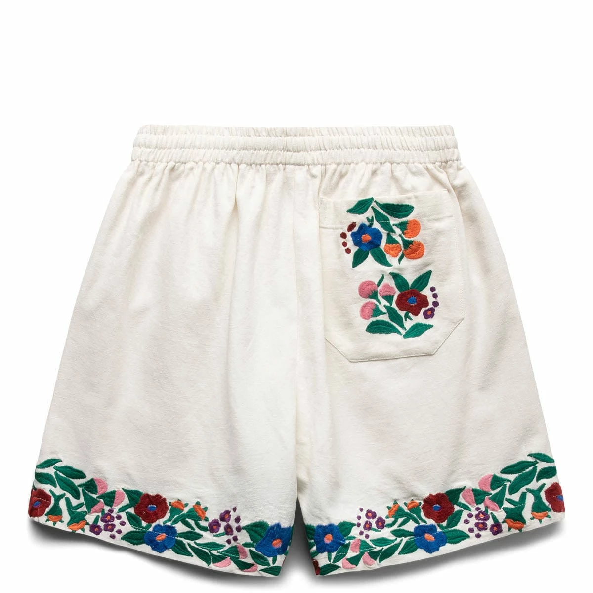 These shorts are inspired by a 1920s folk dress. The Shorts feature a faithful reproduction oof folk floral embroidery that was developed during the interwar period as an alternative to traditional red and white linen folk embroidery.