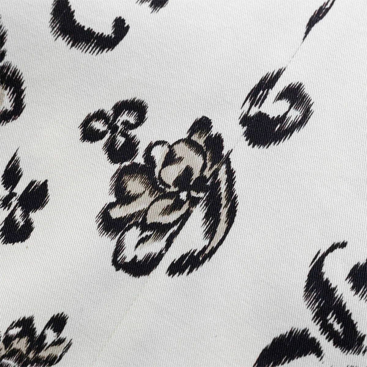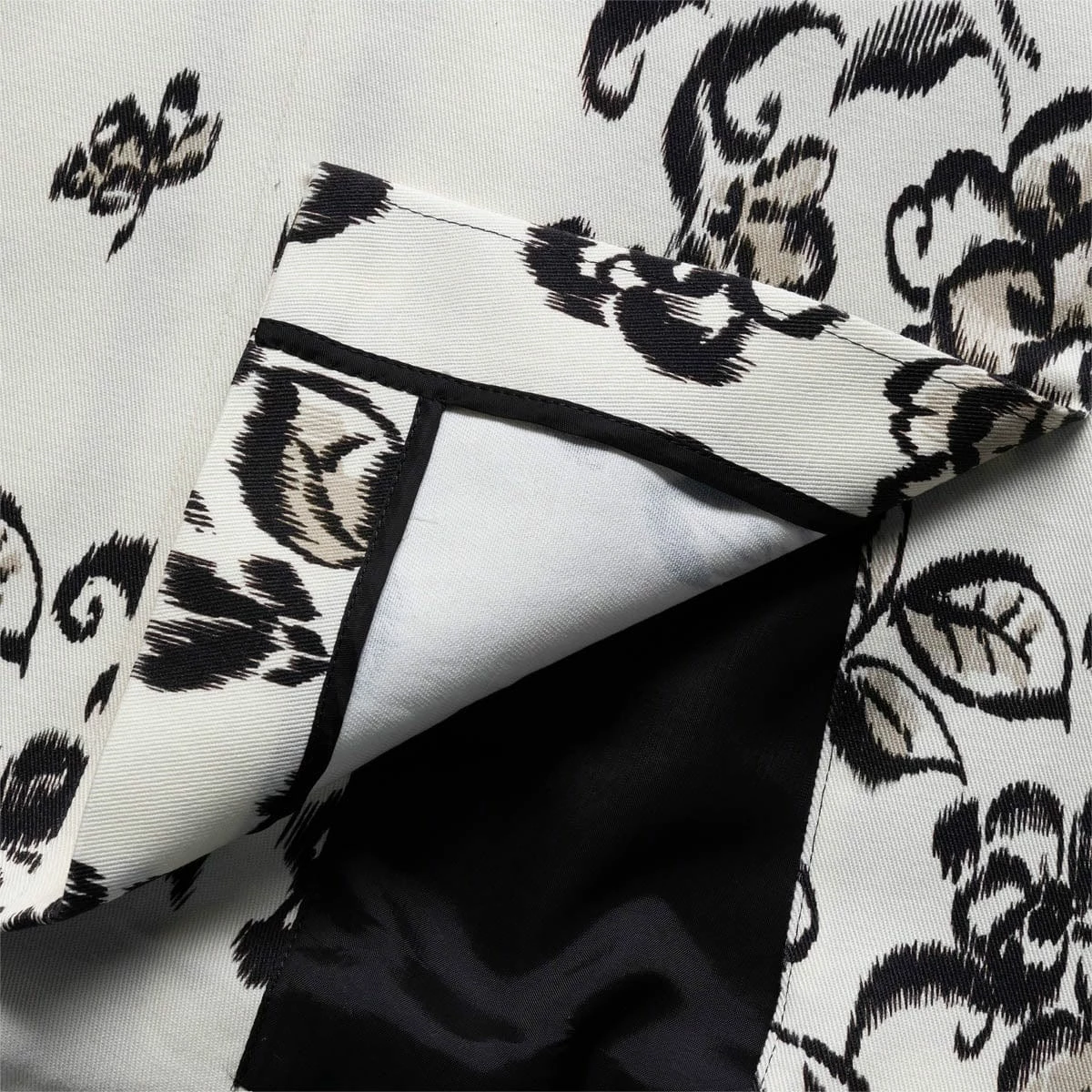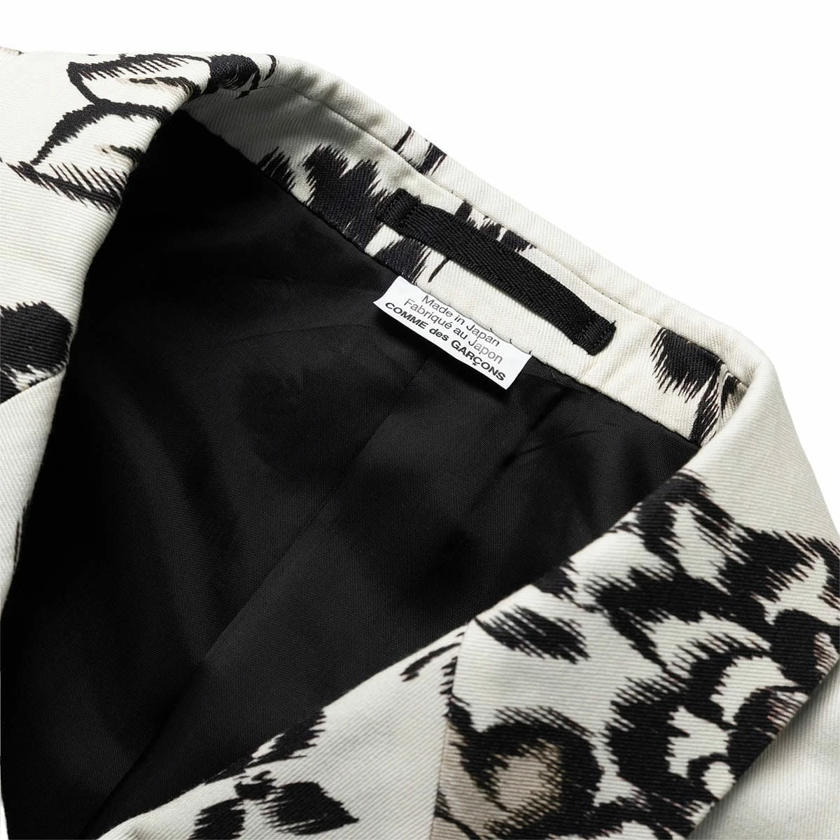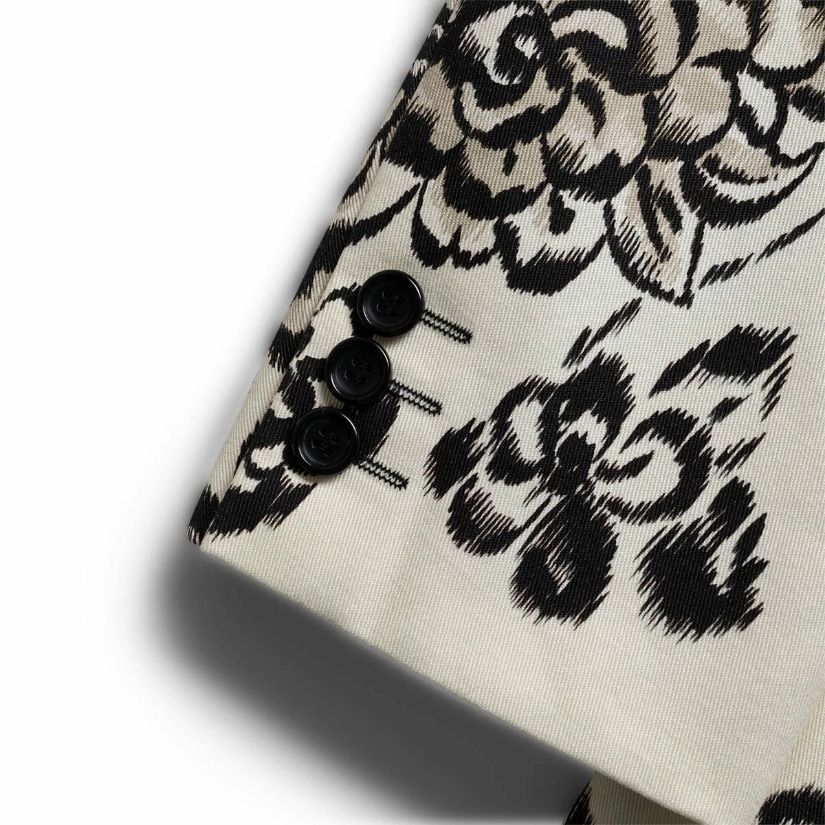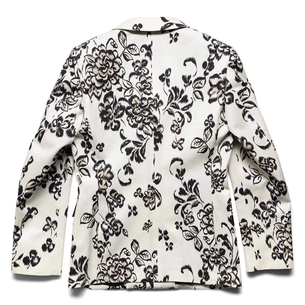 - Double breasted, peak lapels, padded shoulders, long sleeves, buttoned cuffs, one welt pocket at chest, all-over floral pattern, two flap pockets at sides, double vent, partially lined