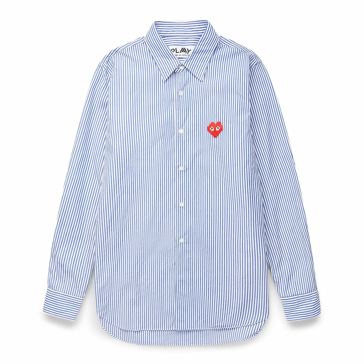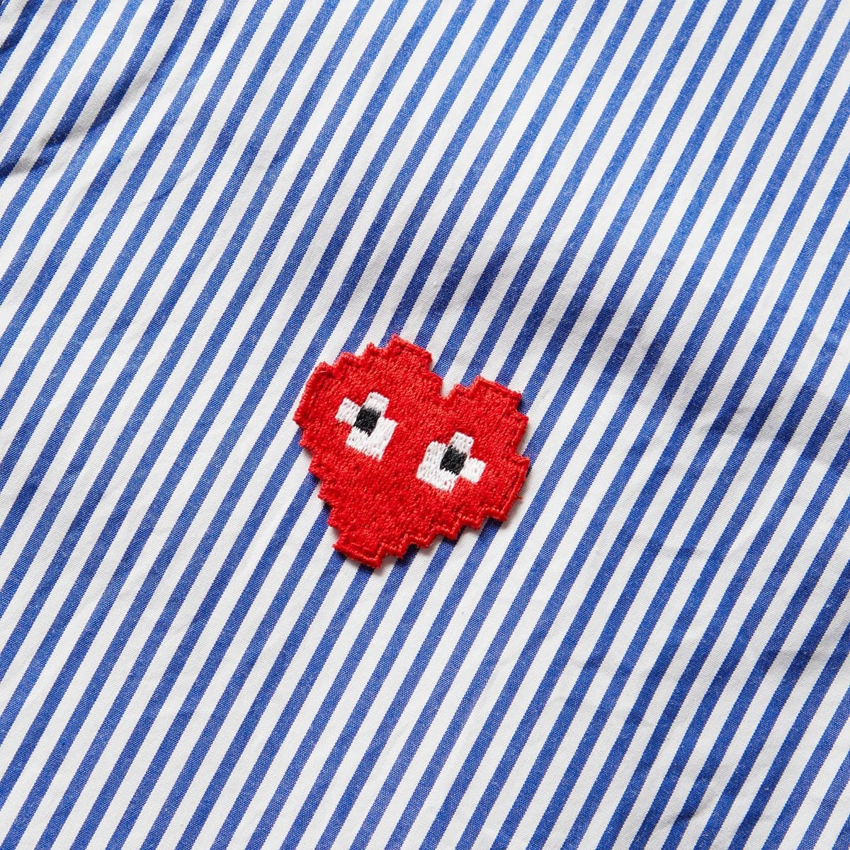 The Invader Heart Striped Shirt carries forth an effortless button down clad with classic blue stripes and a digitized heart which pops off the left chest.