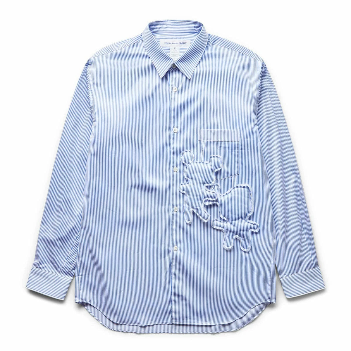 Comme Des Garçons SHIRT pokes fun at the classic striped button down with appliqué detailing.