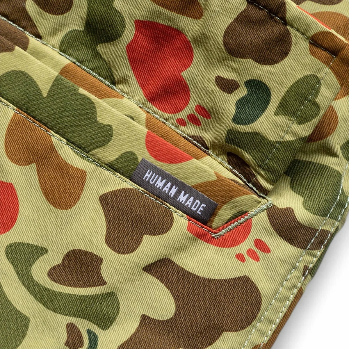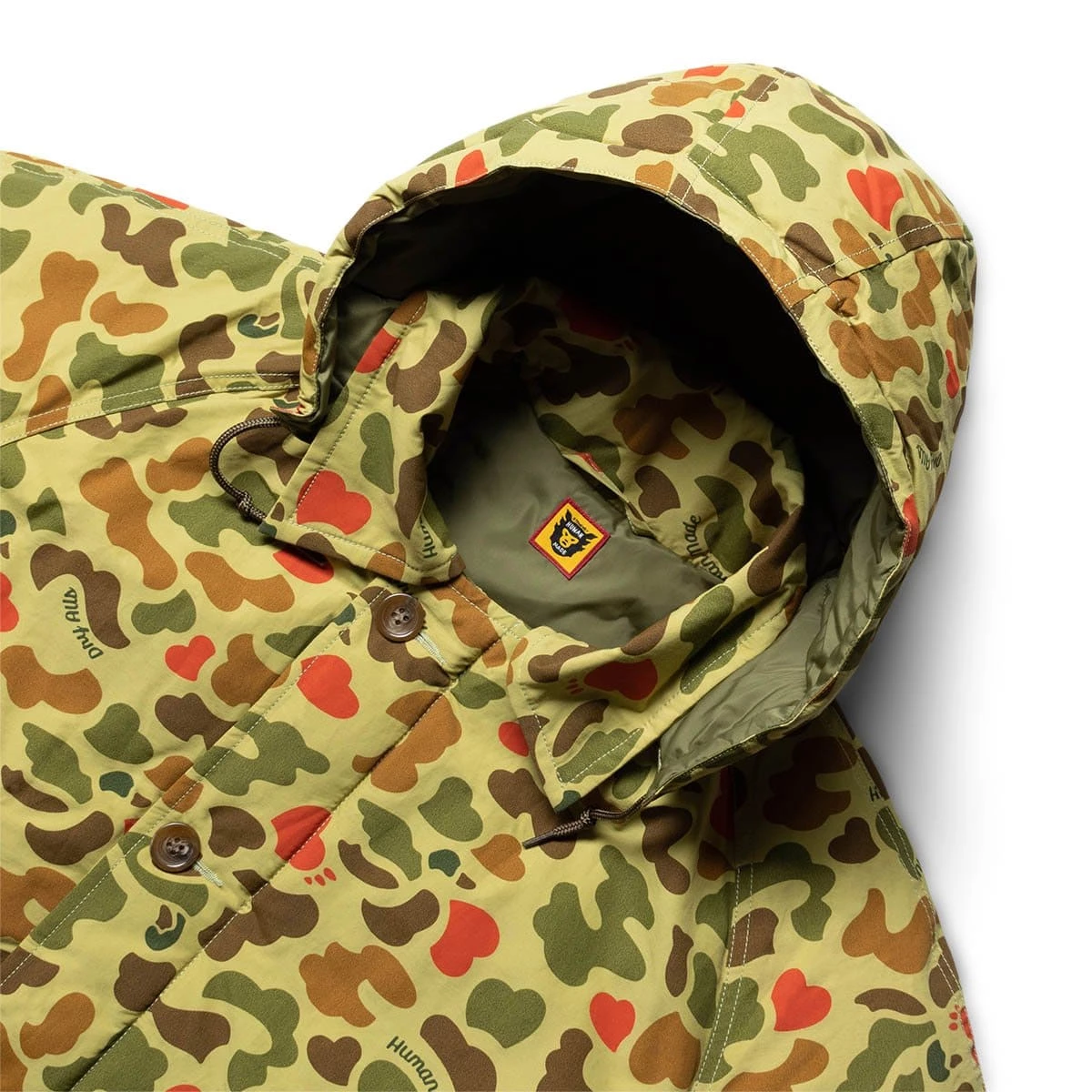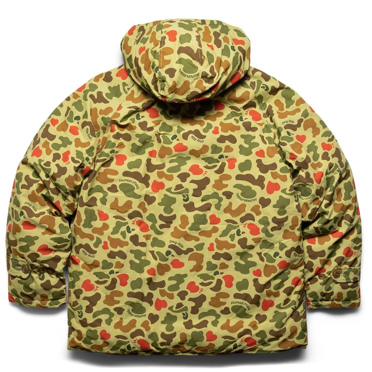 Down jacket with original camouflage pattern. It features a removable hood, hand warmers, and rib knit cuffs.