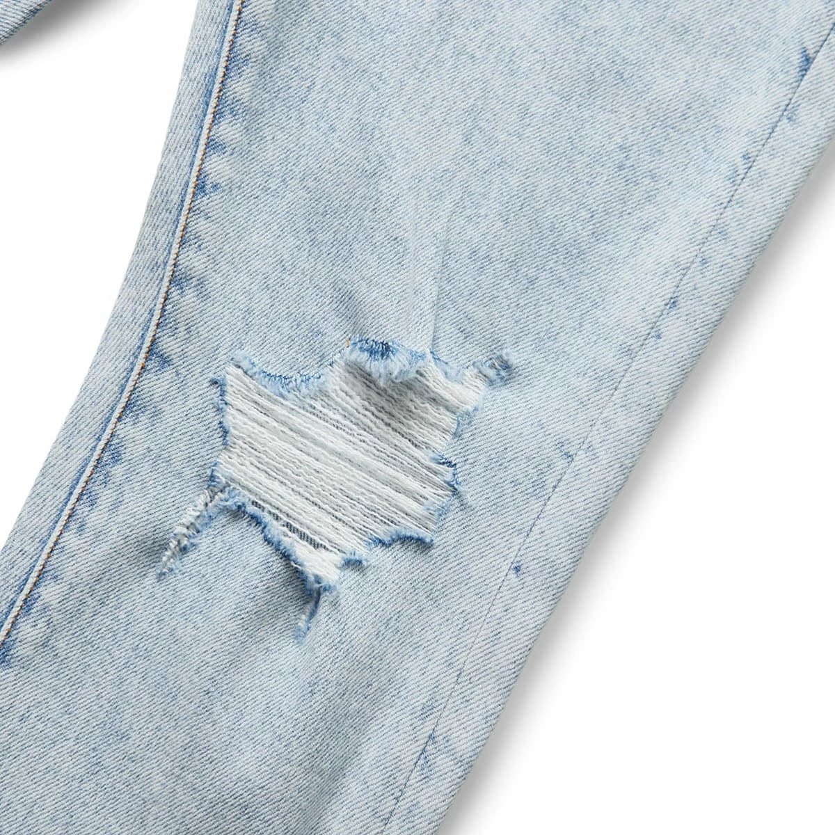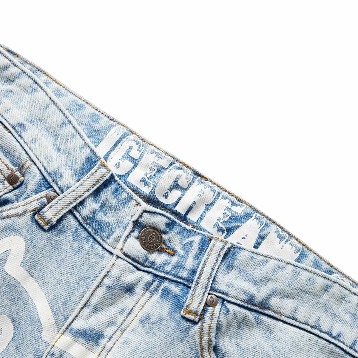 Baby-blue jeans boasting a Running Dog graphic and distressing at the knees by ICECREAM.