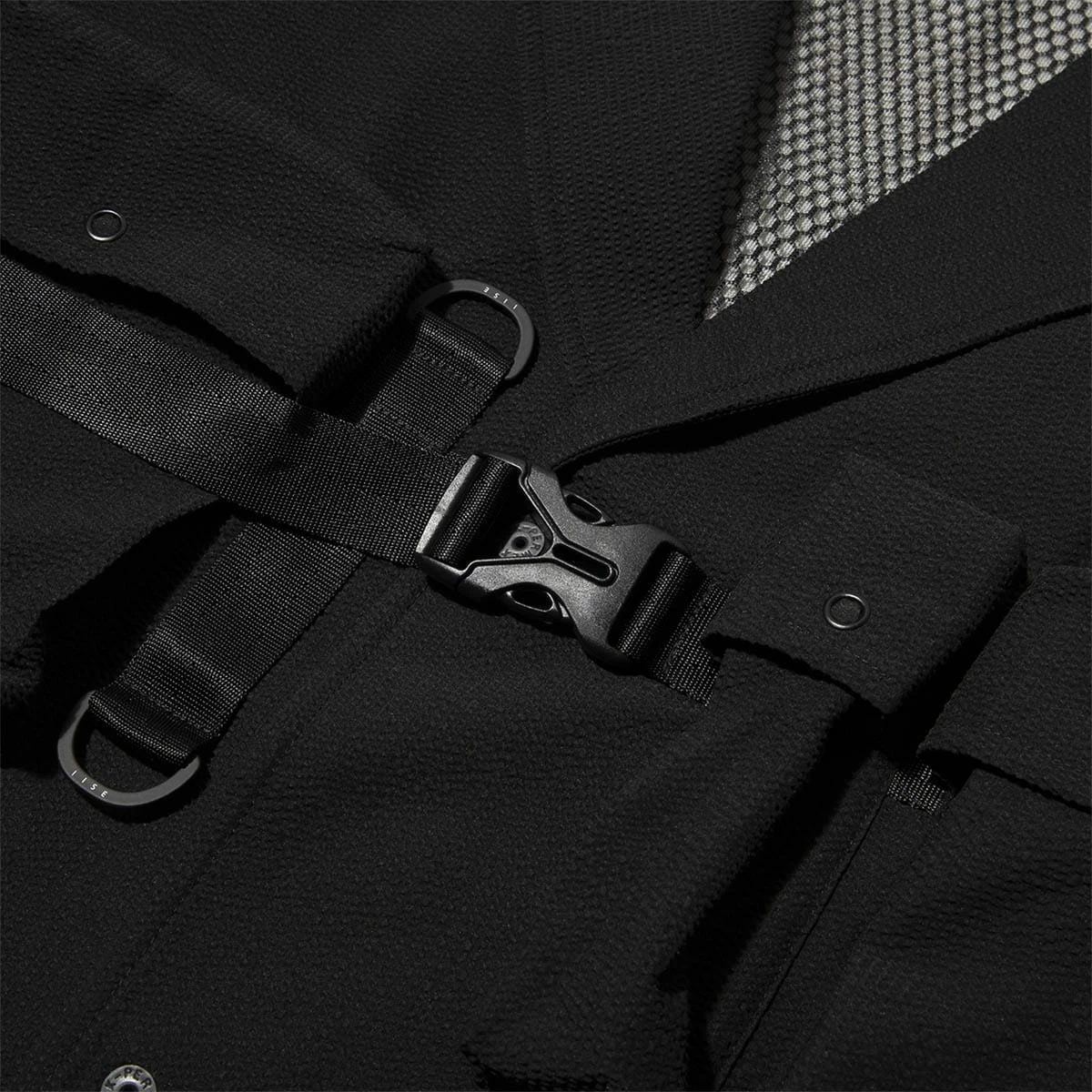 - Adjustable front webbing strap with buckle closure