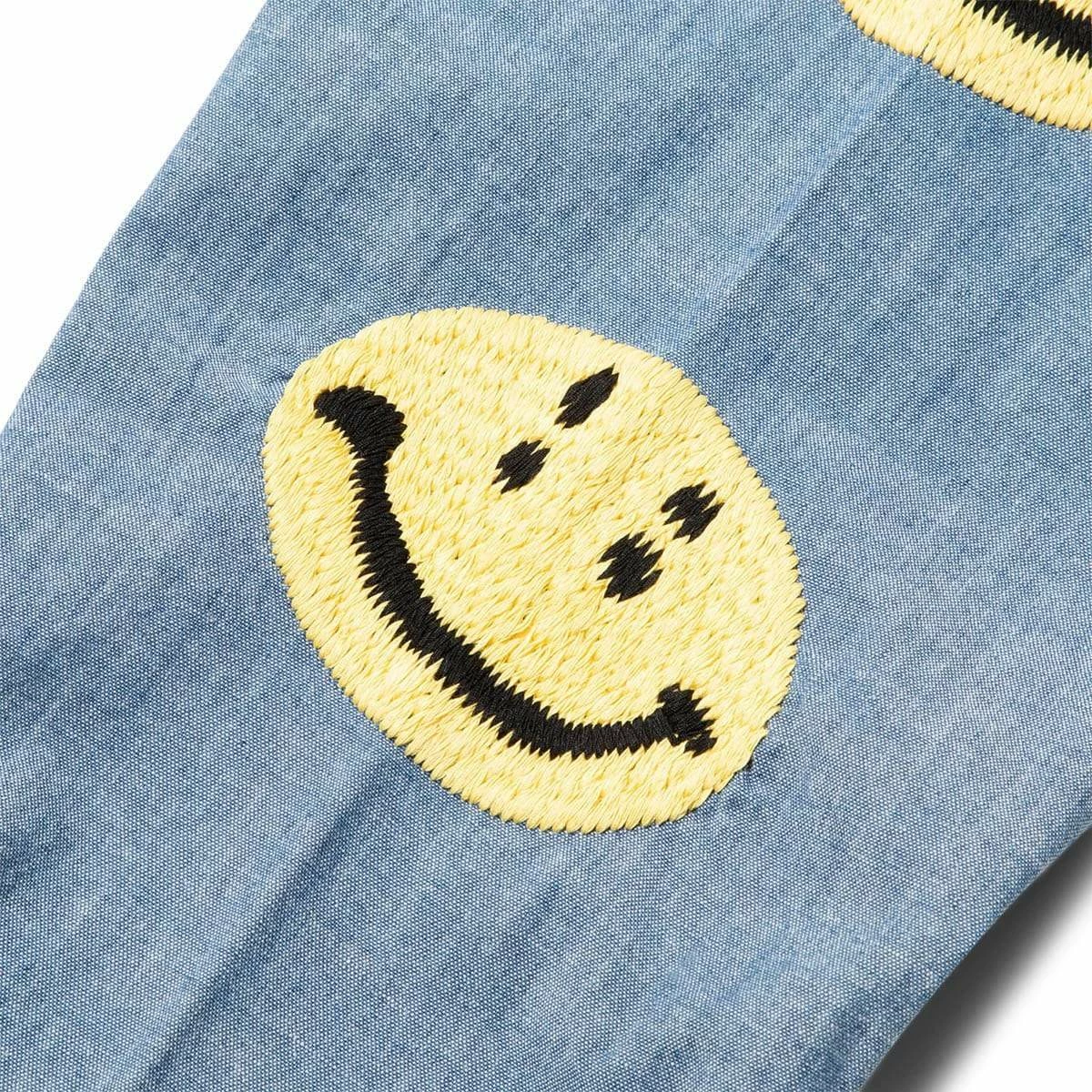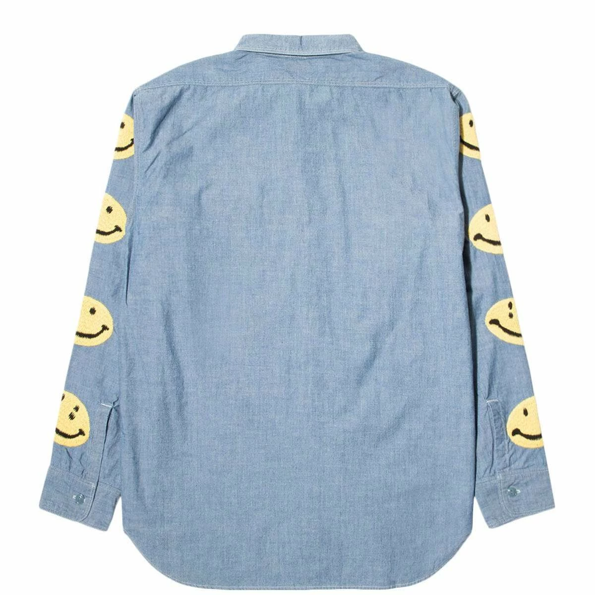 A refreshing chambray work shirt with a smile embroidered on the sleeve. A design with smiles lined up on the sleeve in the hippie embroidery atmosphere found in vintage western shirts and work shirts.