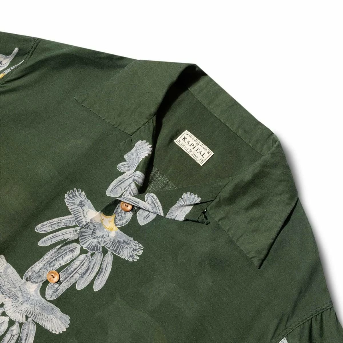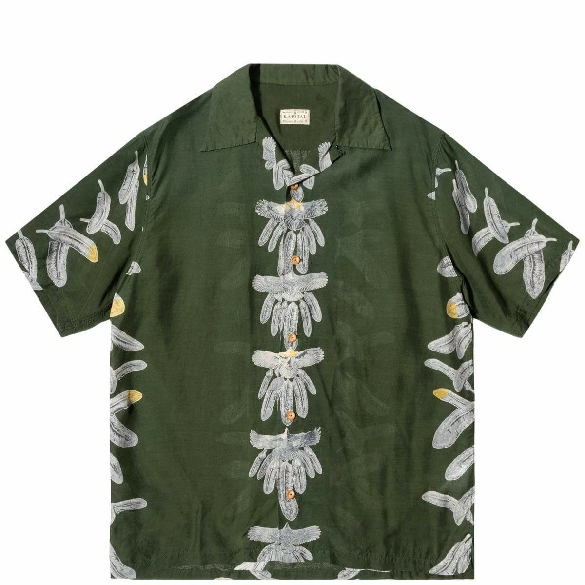Aloha shirt with eagle-shaped accessories printed in denim-like colors in supple and soft silk cupra. Relaxed and straight silhouette.