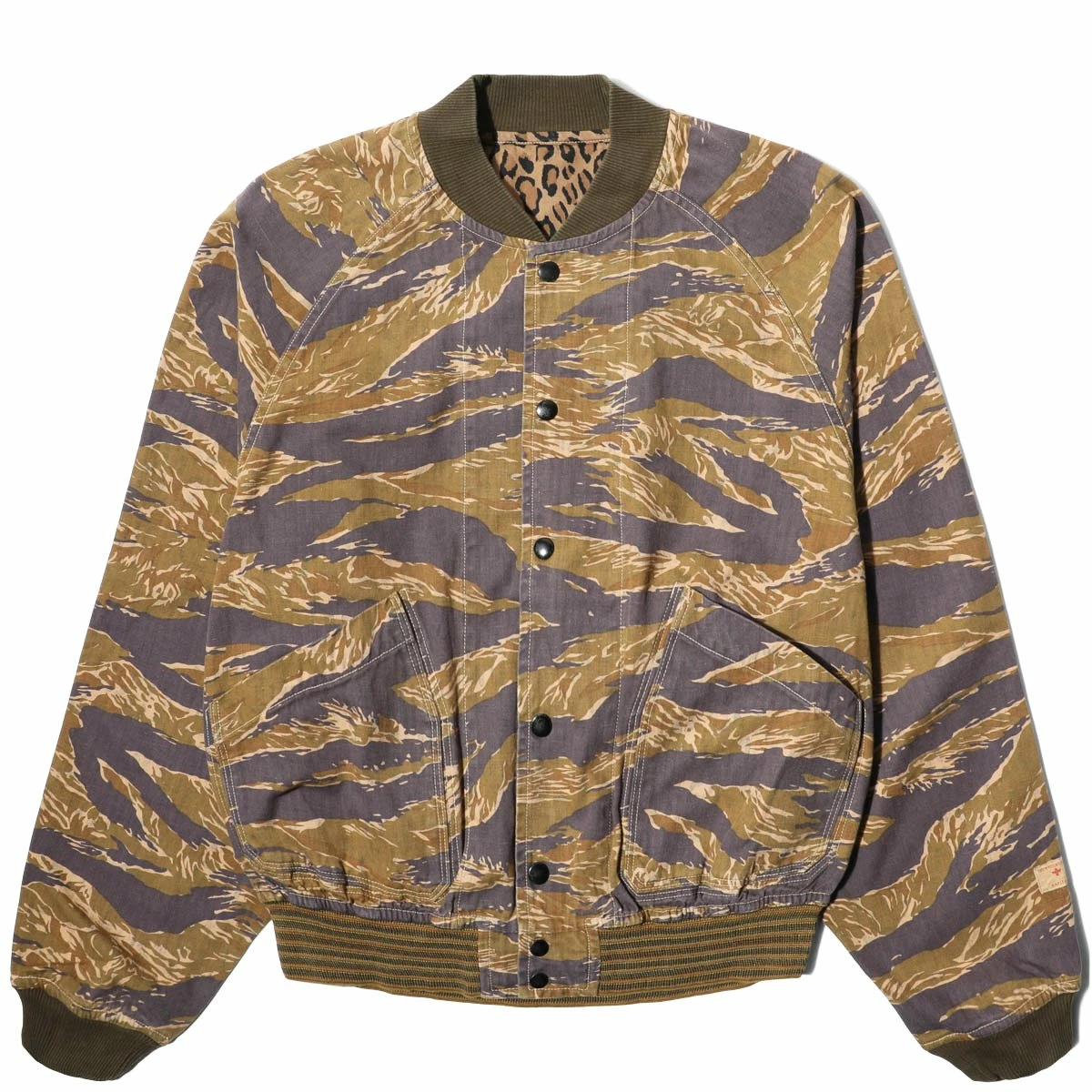 This vintage-inspired, fully reversible Blouson is woven from rugged herringbone cotton featuring Tiger Camo on one side and leopard print on the other. Produced with two utilitarian patch pockets at the waist on each side and flexible ribbed collar, cuff, and hem for added comfort. Finished with a relaxed, roomy fit hitting at the waist.