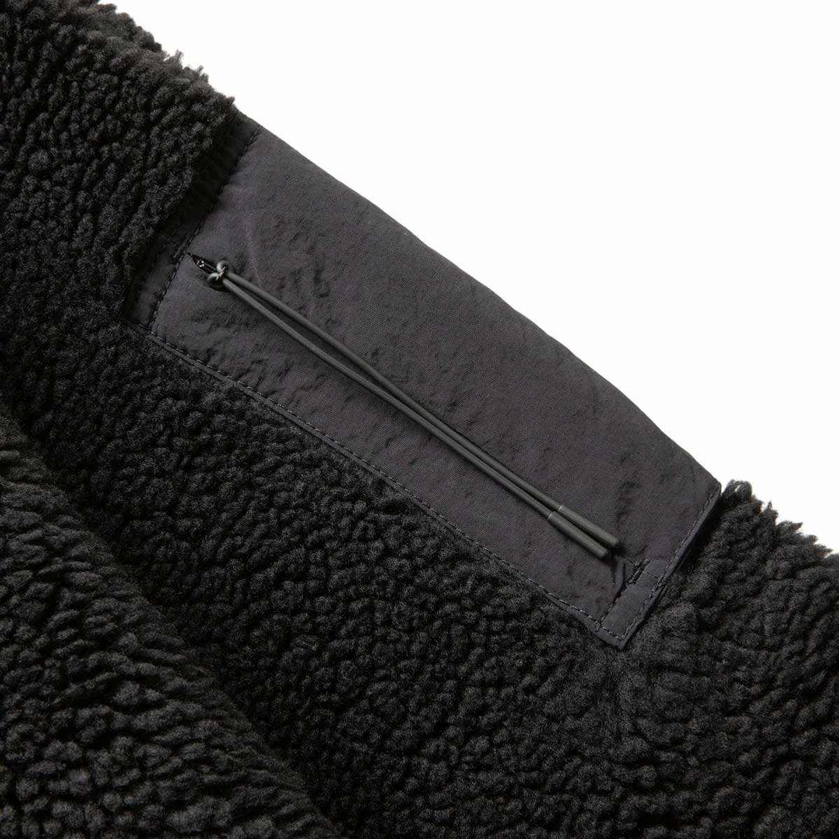 Sherpa fleece pullover hoody in black, with a large kangaroo front pocket in recycled nylon and an asymmetric half zip closure. Heavyweight synthetic fleece with lofted fibers that trap the air for warmth and insulation.Â