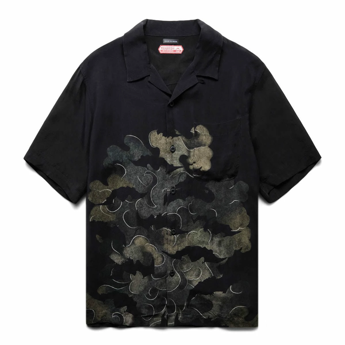 Black camp collar shirt cut from an eco-conscious Japanese Cupro, for a relaxed fit. Featuring Cloud of Bats Print.