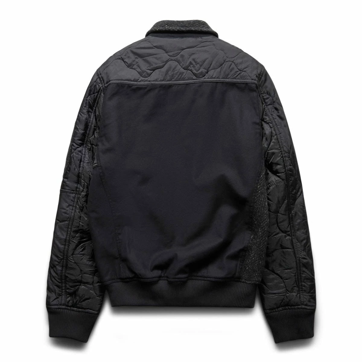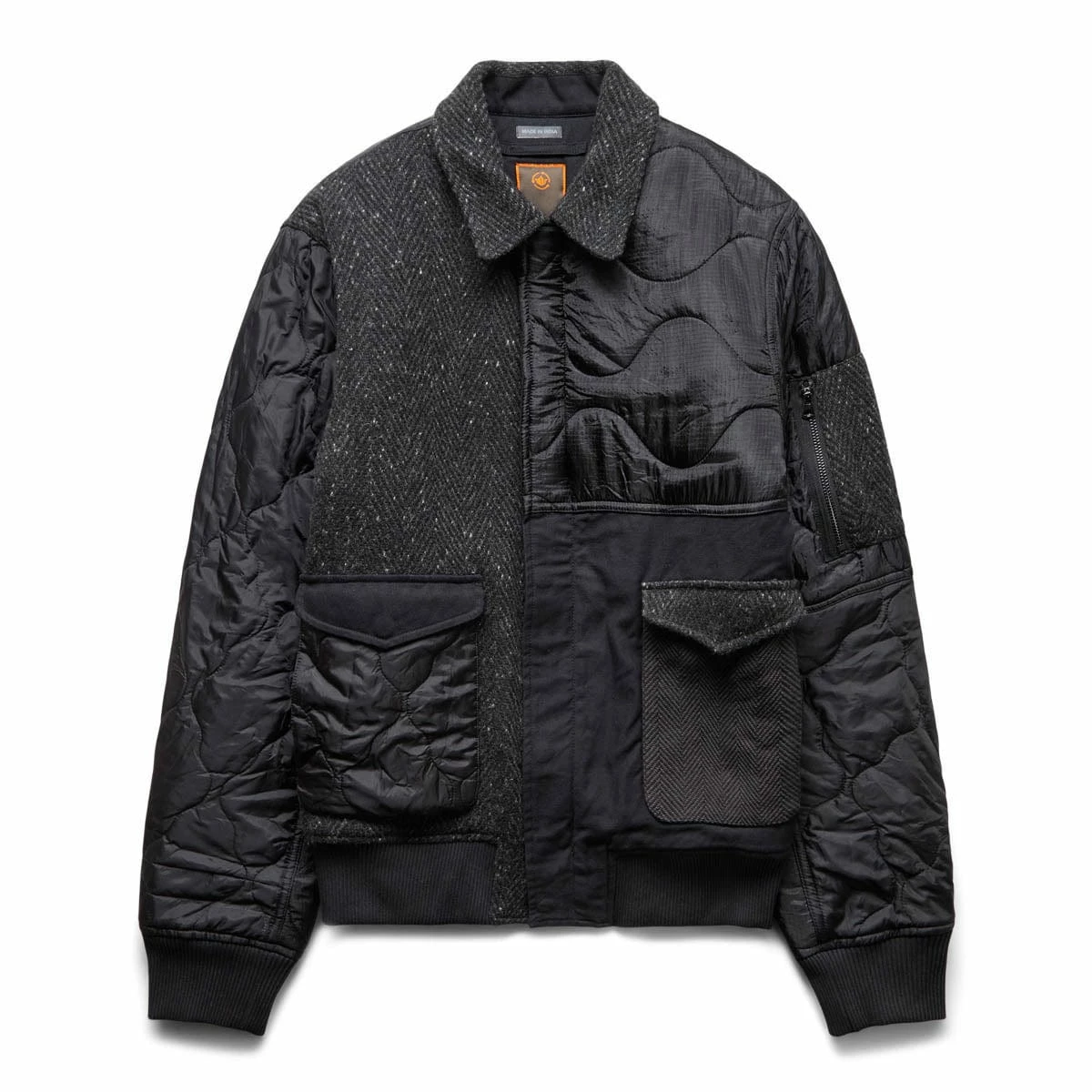 The Maharishi UPCYCLED A2 FLIGHT JACKET in black, upcycled from a panel work of vintage military liners as well as organic fabrics.