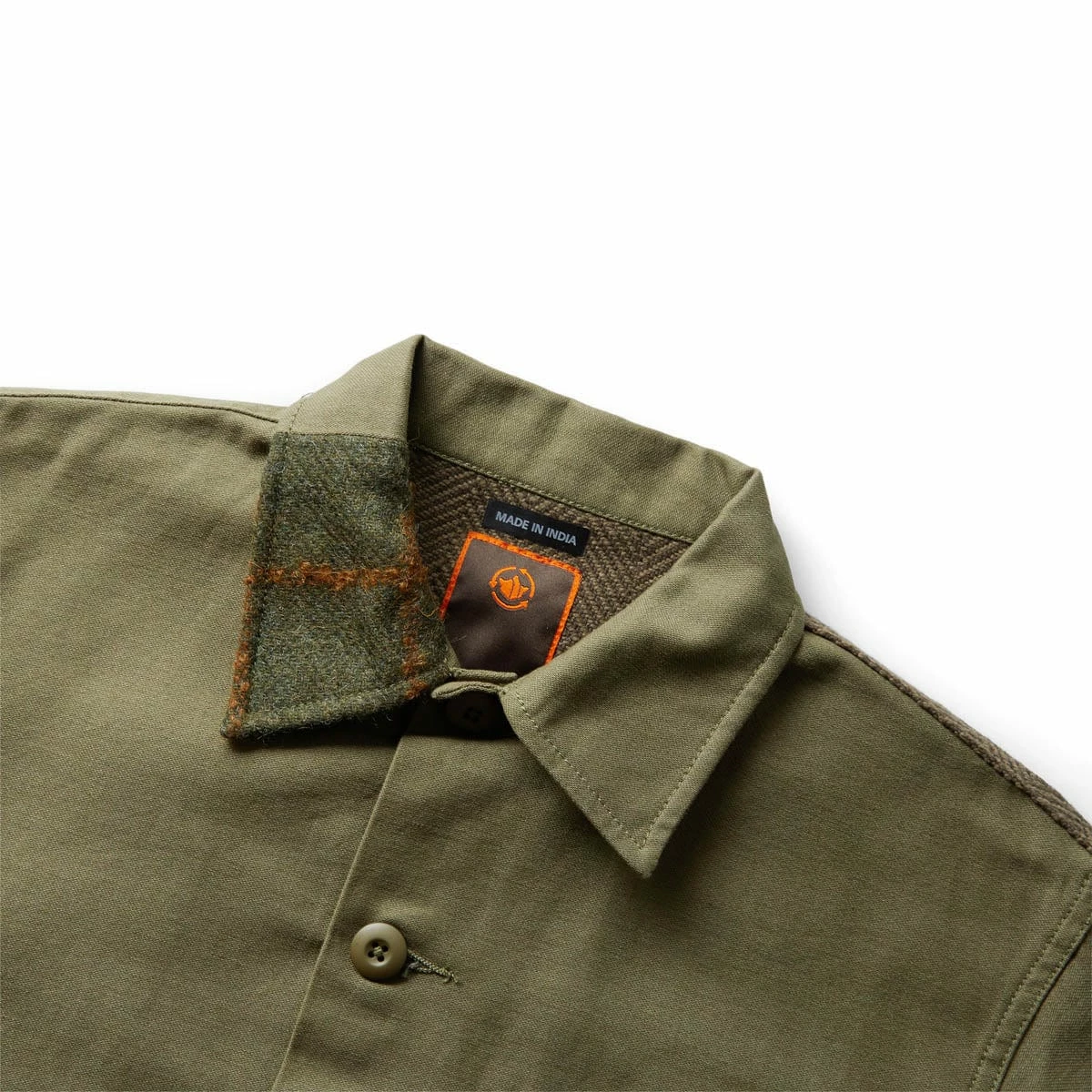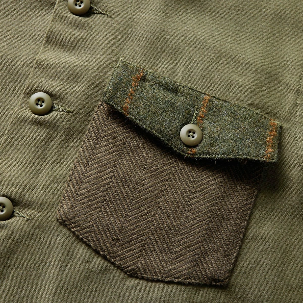 Relaxed fit overshirt in Olive, featuring a panel work of vintage military liners as well as organic fabrics.