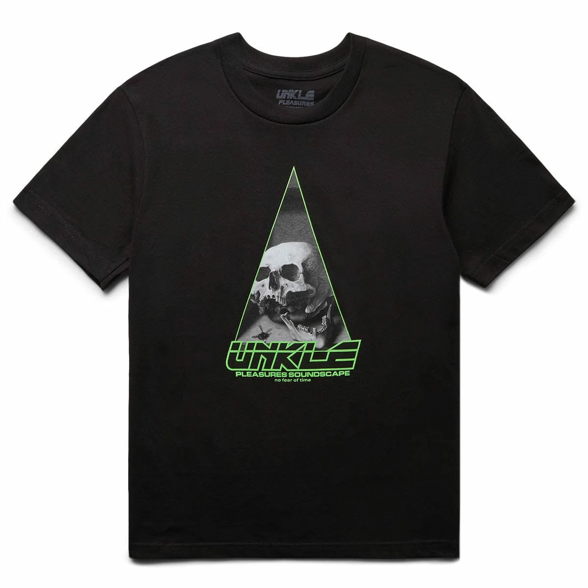 From the mind of designer Alex James, Pleasures is a contemporary expression of the eternally influential and relevant 80s and 90s subcultural aesthetics. James has lived and loved the sources of Pleasures’ inspirations, which sets it apart from the reference mining pack. Black t-shirt made for all day comfort, with design from collab with UNKLE.