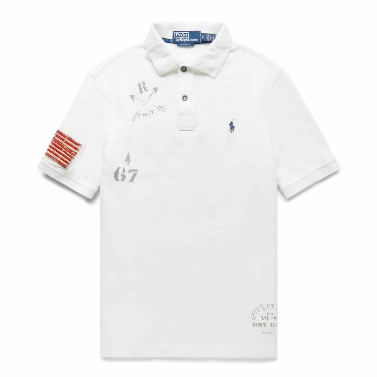 - Ribbed Polo collar. Two-button placket. Short sleeves with ribbed armbands. Historical American flag patch at the right sleeve.