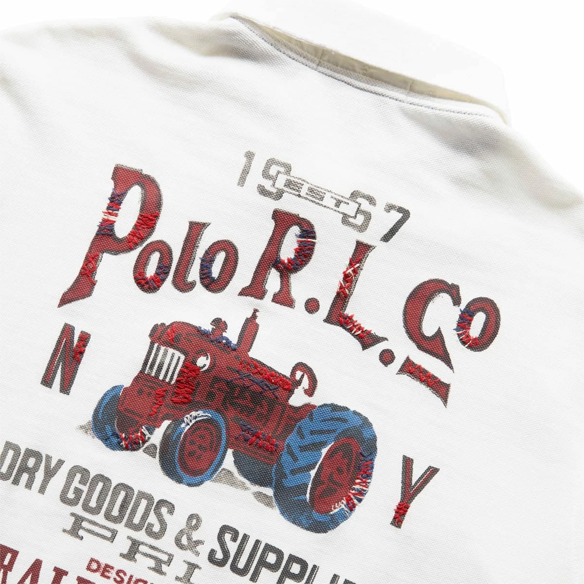 - Signature graphics printed all over. Embroidered details. “Polo R.L. Co” and a tractor printed at the center back. Tennis tail.