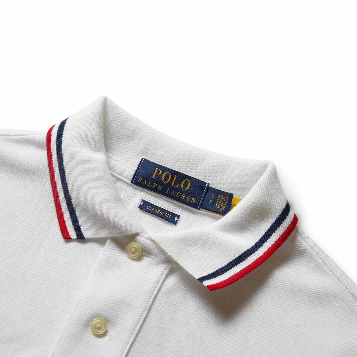 - Ribbed Polo collar with striped tipping. Two-button placket.
