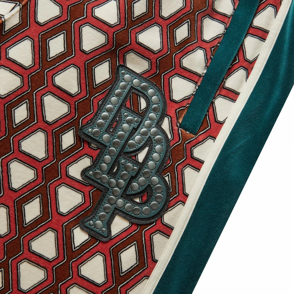 - Felt and rhinestone patches on front left leg