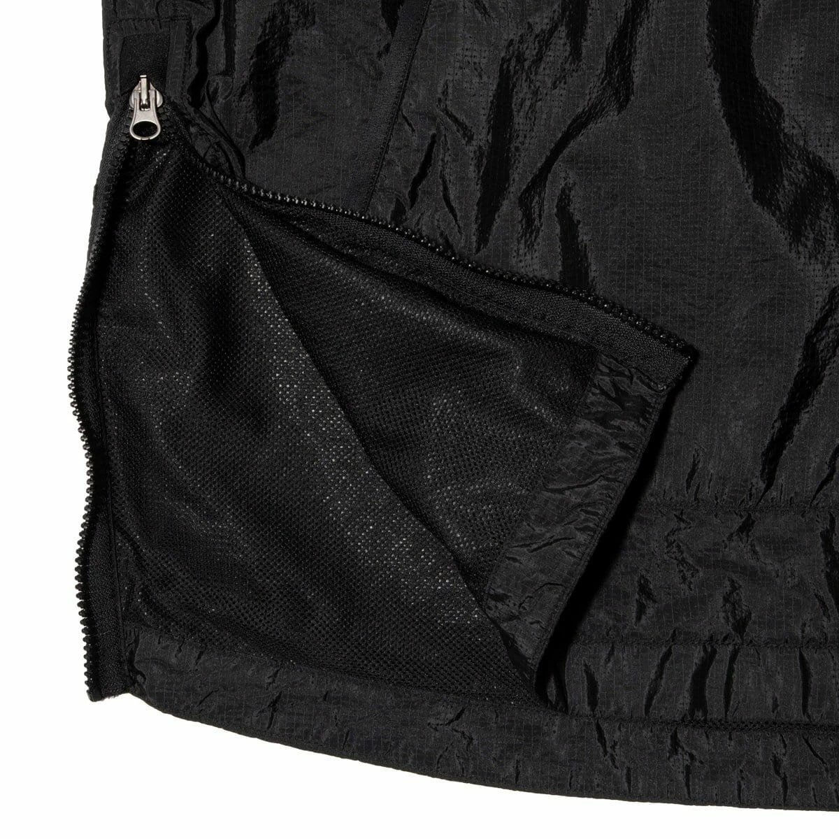 NYLON METAL RIPSTOP: Anorak in Nylon Ripstop. The trilobate structure of the nylon yarn, with its gray weft and white ready-to-dye warp colors, is the basis for the distinctive metallic and tonic sheen of Nylon Metal, one of the most versatile fabrics born out of STONE ISLAND’s textile research. Garment dyed with an elaborate double dye procedure. Fastening zippers are engineered to be colored by the garment dye procedure. Nylon mesh lining.