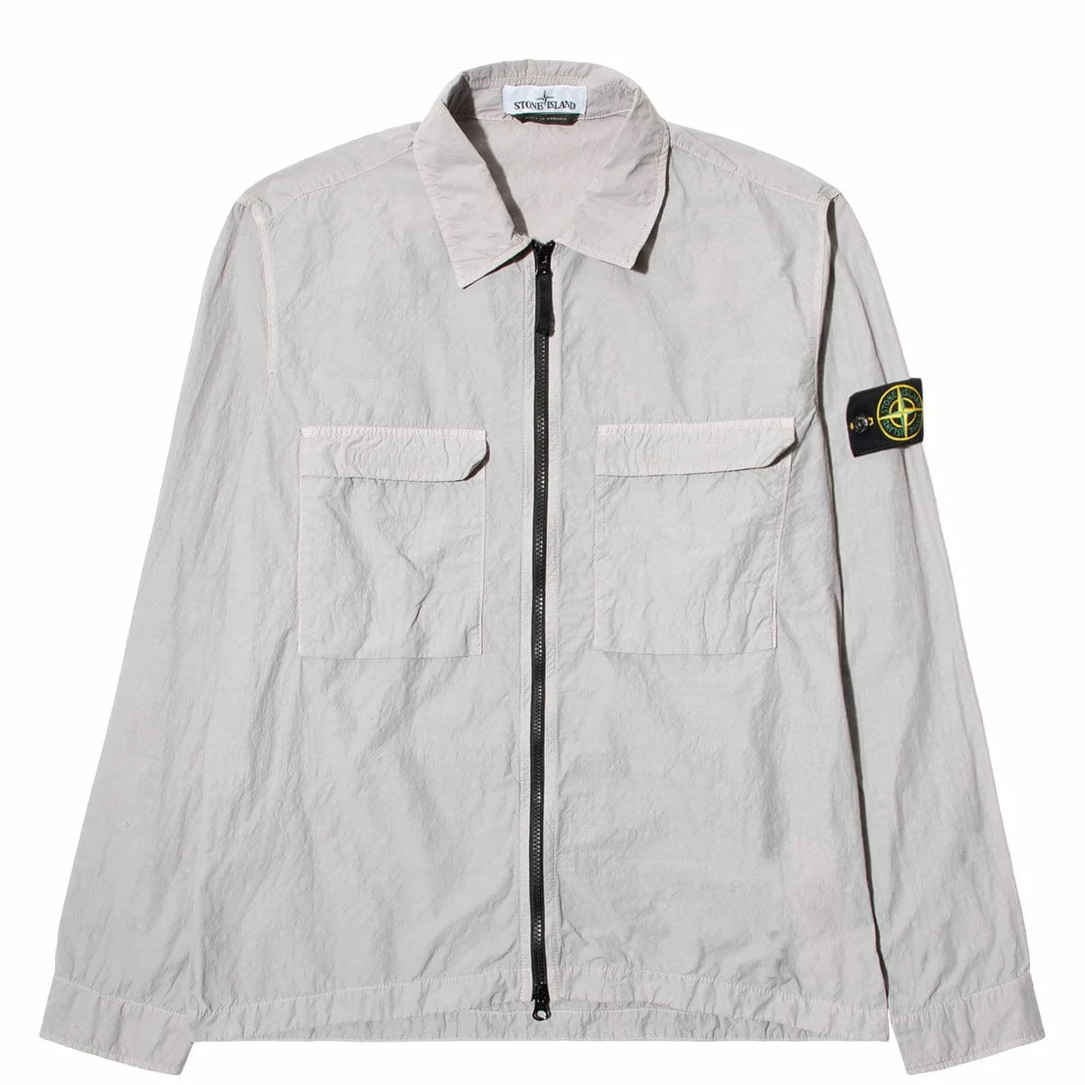 Overshirt in a light, durable and abrasion resistant fabric composed of mechanically spun nylon. The nylon filaments are steamed during the spinning process to create an appearance closer to organic fibers. Garment dyed.
