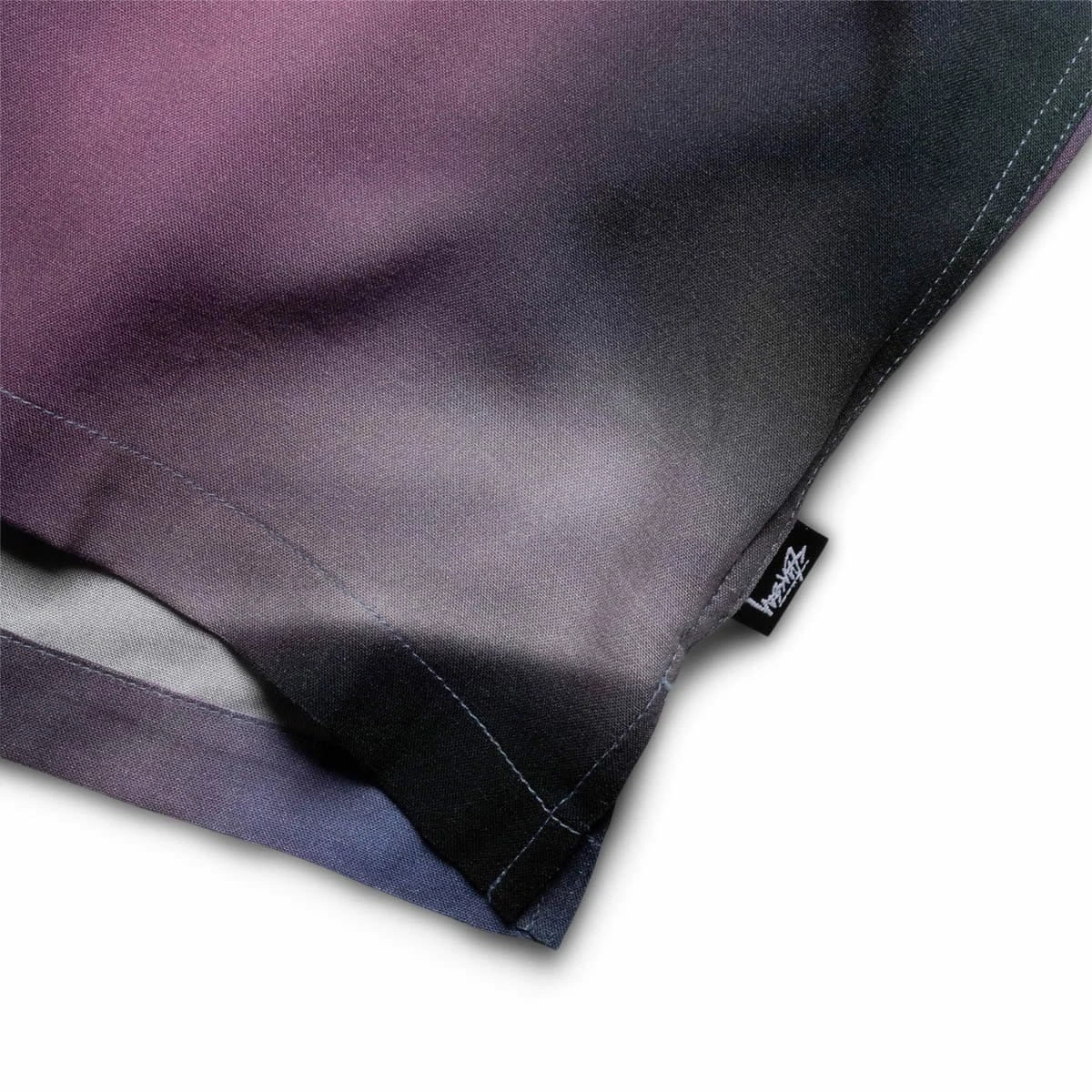 Open collar shirt with enlarged motion print. Left chest pocket, plain front placket with pearl buttons, self-fabric top button loop, and 2″ side vents. Finished with straight bottom hem, rear side pleats, and Stüssy stock flag label at side seam.