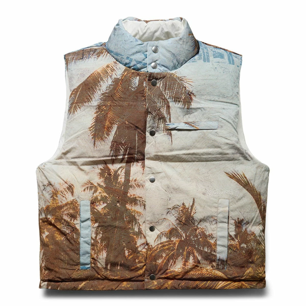 Reversible down-filled nylon puffer vest with original artwork by Peter Sutherland.