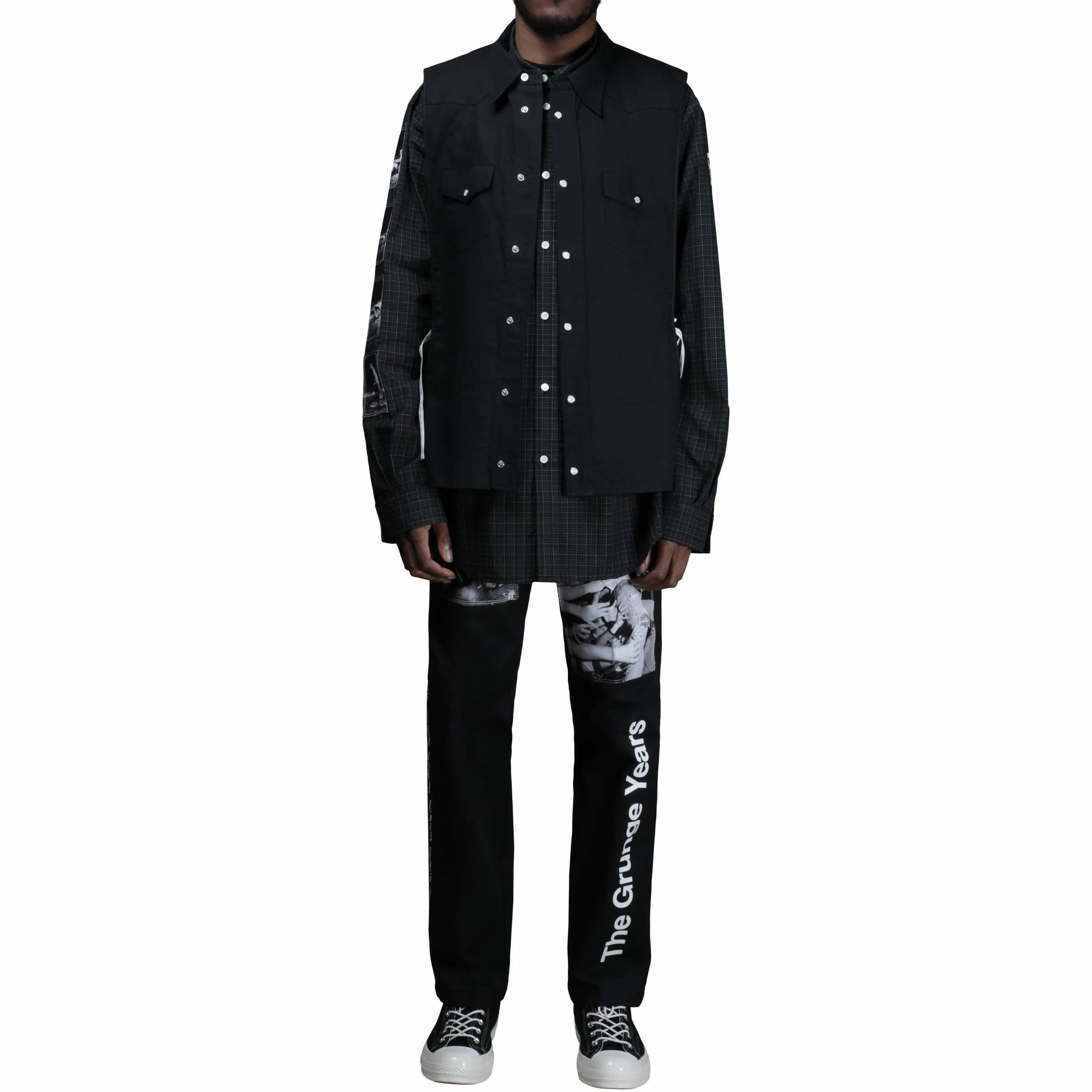 Takahiro Miyashita’s Spring/Summer 2019 collection adjusts the levels of the alternative rock influences that inform his creative output. As with the actual music being celebrated, all subtlety has been purposefully set aside. Miyashita has taken famous imagery from celebrated Seattle scene photographer Charles Peterson and featured it prominently throughout the collection, from hyperbolic graphic tees to all over printed garments to reversible flaps.