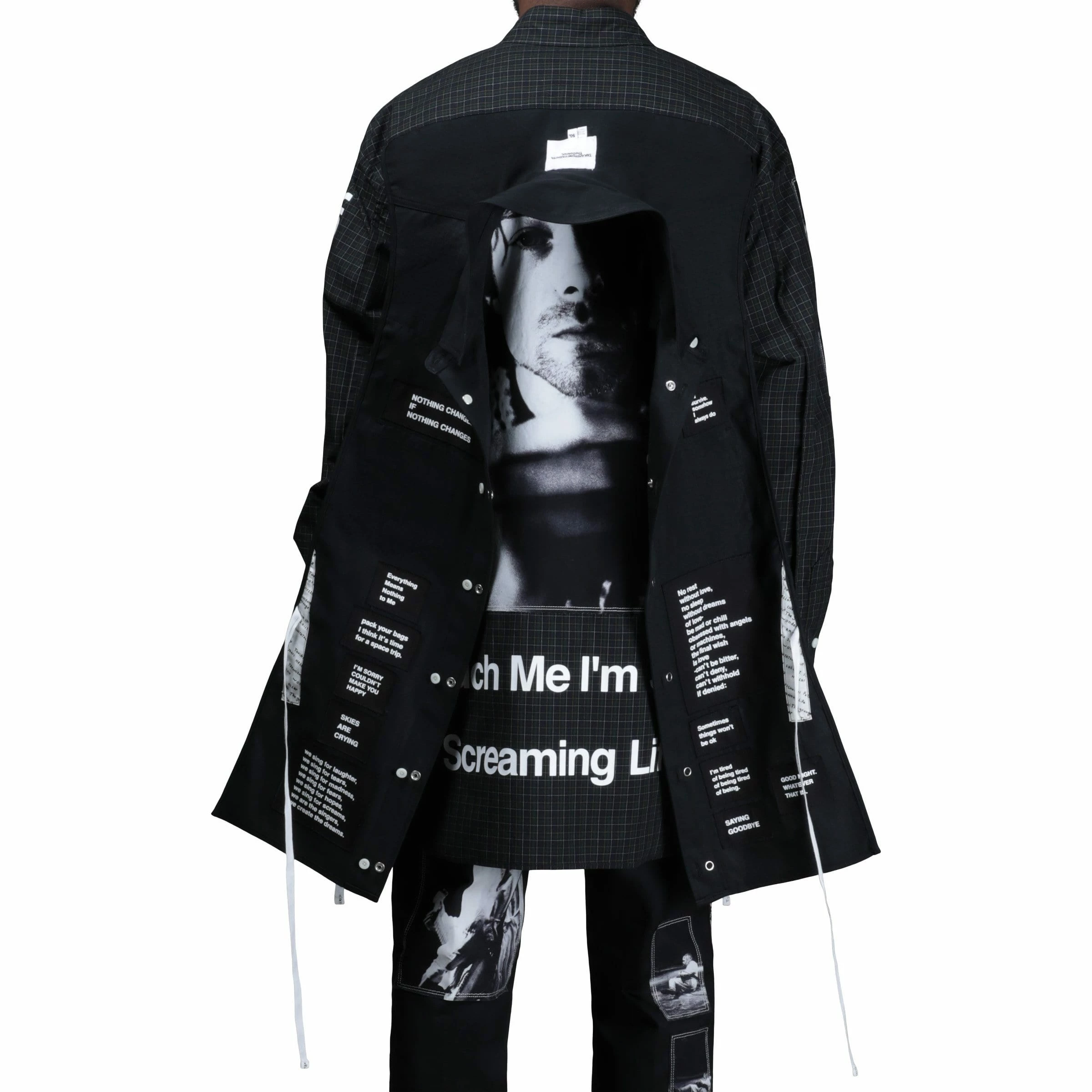 TAKAHIROMIYASHITA The Soloist also highlights other aspects of Americana into the grunge-centric collection. Bomber jacket silhouettes made from reclaimed vintage quilt patterns, an oversized, label branded, poncho/blanket hybrid, and the designer’s own, distinctive takes on staple pieces.